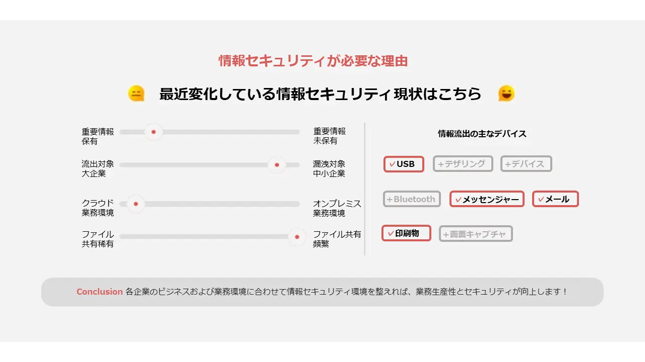 ファイルアップ/ダウンロードが多くなりました。 これにより、生産性は高まったとしても、セキュリティは弱くなりました。