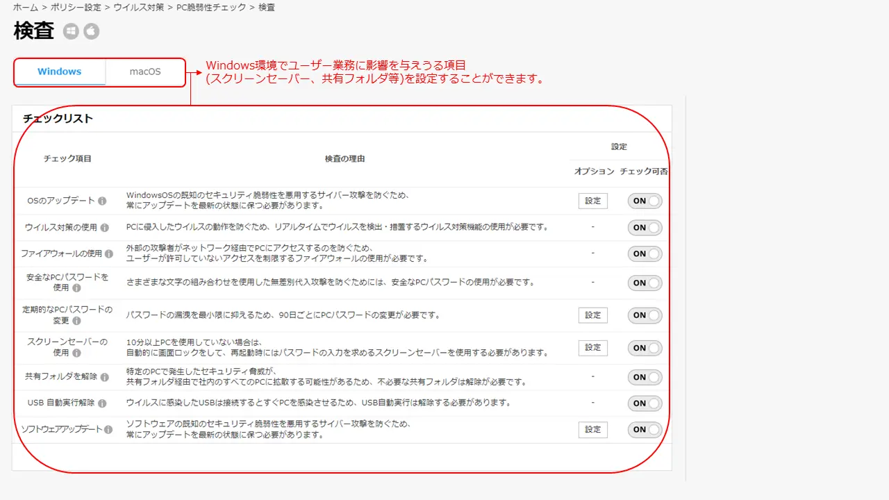 また、セキュリティポリシーグループ別に、チェック項目をそれぞれ設定することができ、「PC脆弱性チェック」機能自体、またはチェック項目別(非)活性化を通じて、社内セキュリティポリシーによるカスタマイズ設定も可能です。