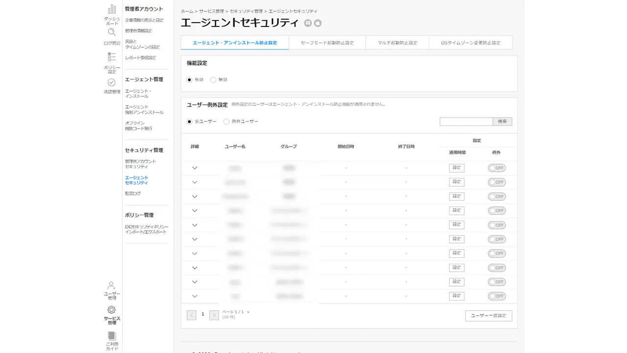 1. 管理者ページ > [サービス管理] > [エージェントセキュリティ] メニュー