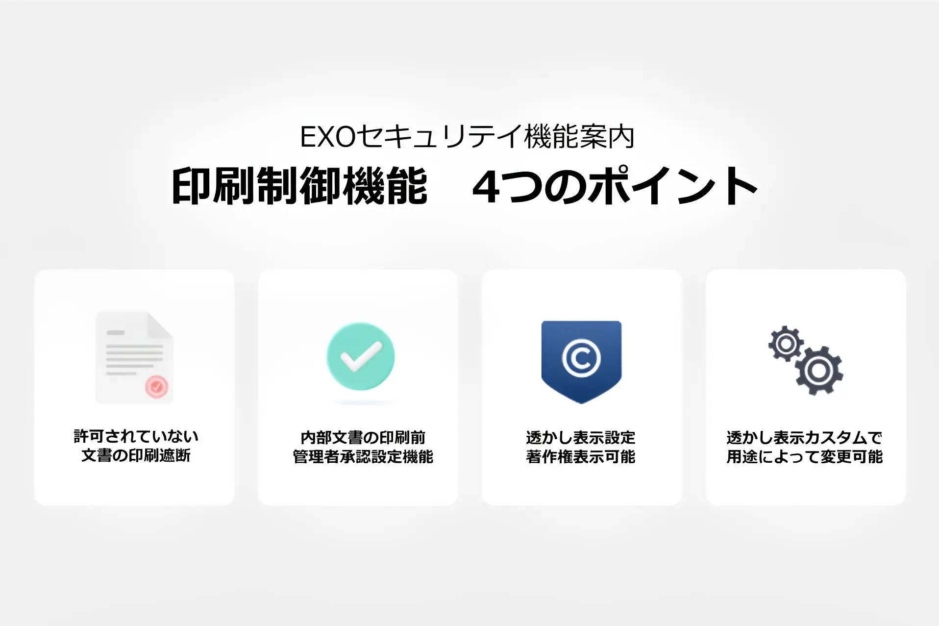 EXOセキュリティに新たに追加された「印刷制御」機能では、未許可印刷の制御、管理者承認、透かし文字の付与を通じて、印刷物のセキュリティ強化を実現します。