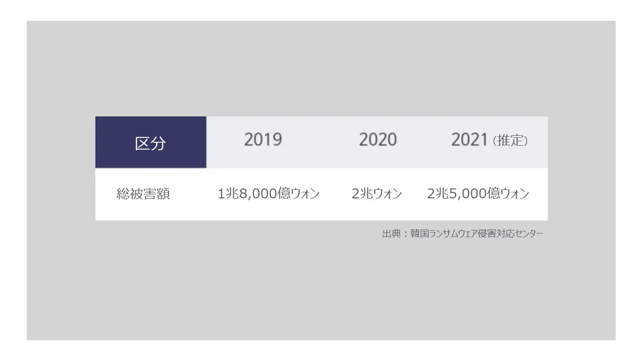 お隣の韓国国内機関で確認した国内ランサムウェア被害額は、2兆5千億ウォン程でありコロナ期間中に被害が6倍も増えました。また被害にあった企業のうち20%は、破産危機に追い込まれるこまれているのです。
